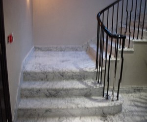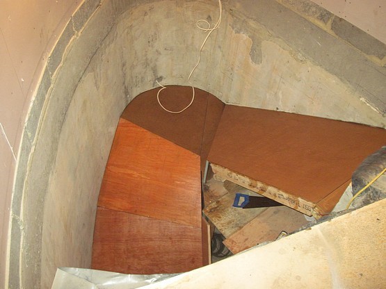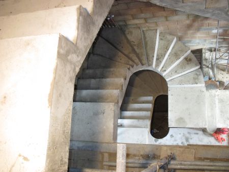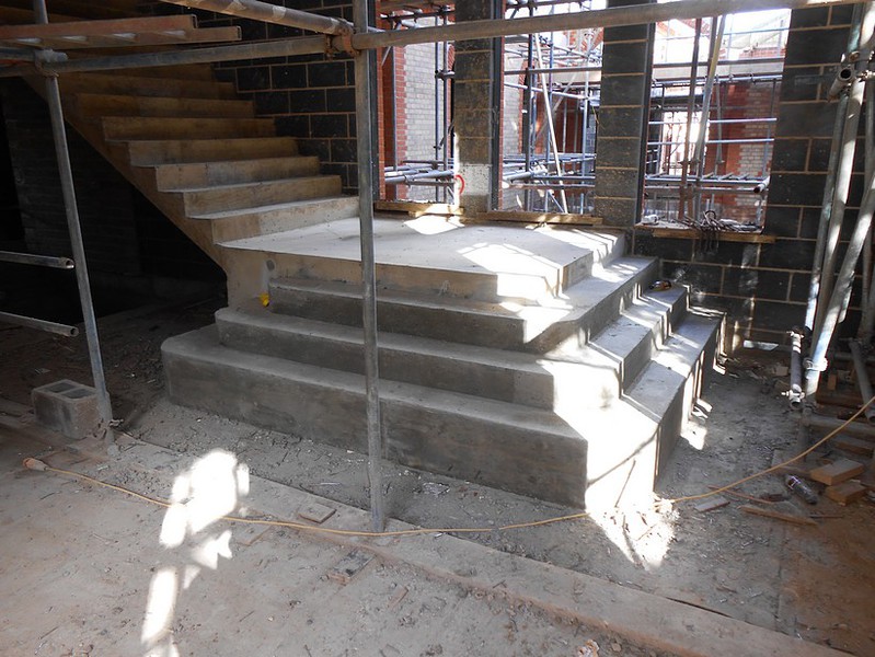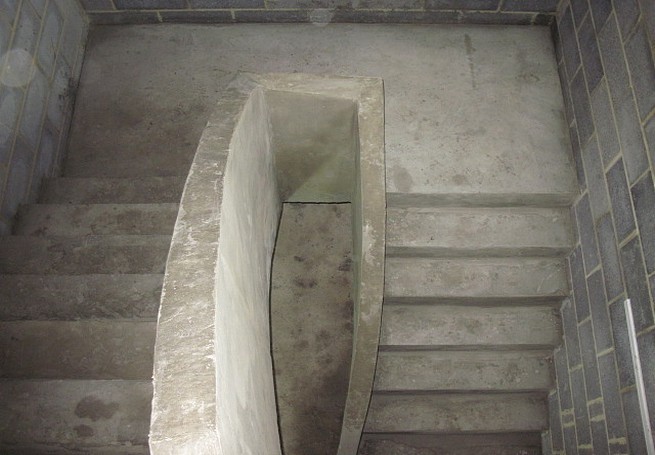 The stairs have a carpet finish, the balustrades/soffits a skim of plaster.