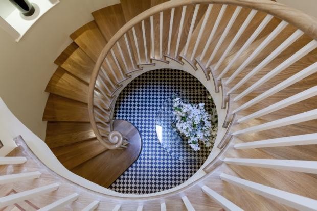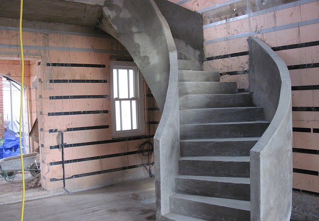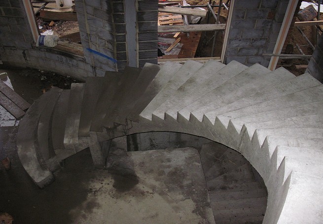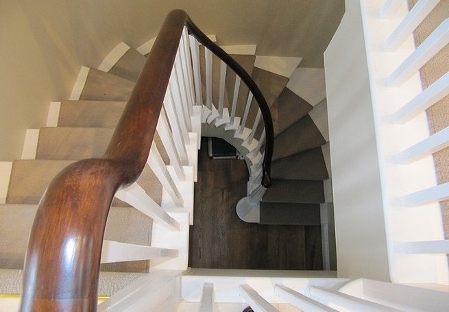 A large wraparound detail with rounded edges connected to a straight run stairs.