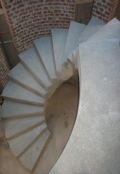 The earliest spiral stairs were built into walls and made of stone or marble.